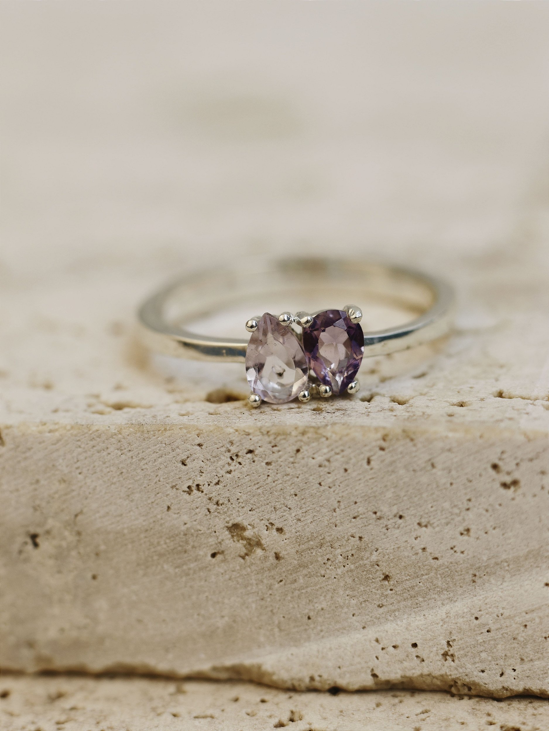 O Aurora Dueto traz duas ametistas em formato de gota: uma roxa e uma rosa. O aro delicado em prata 925 complementa a suavidade dessa joia, que simboliza harmonia e cumplicidade.