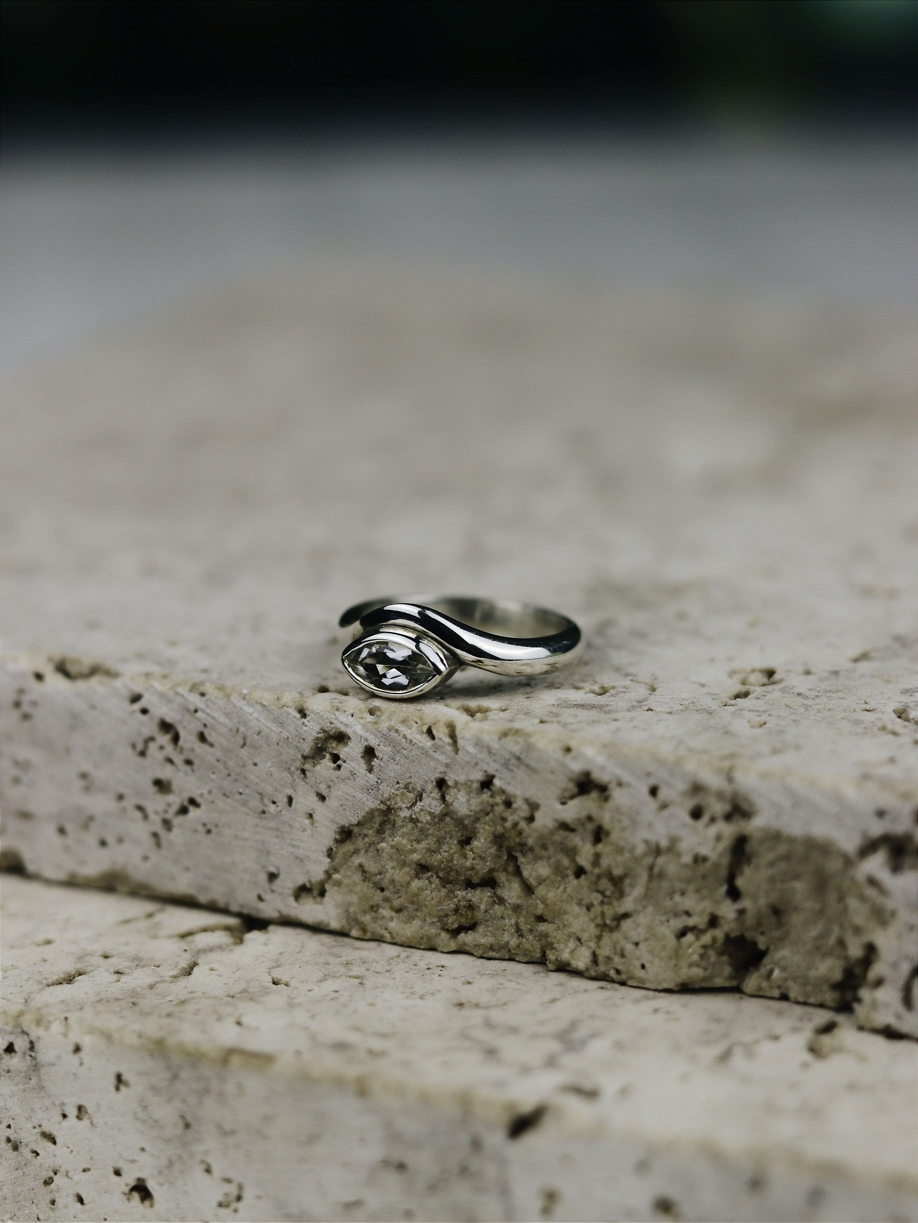 O Anel Navis é um anel de dedinho com design orgânico e fluido, inspirado no movimento das águas e nas travessias que transformam. Seu formato acompanha de forma natural a pedra navete em topázio branco, cravada em cravação inglesa, garantindo segurança, brilho intenso e máxima valorização da gema. Produzido em prata 925, o Navis representa leveza, direção e profundidade, uma joia de presença sutil e sofisticada.