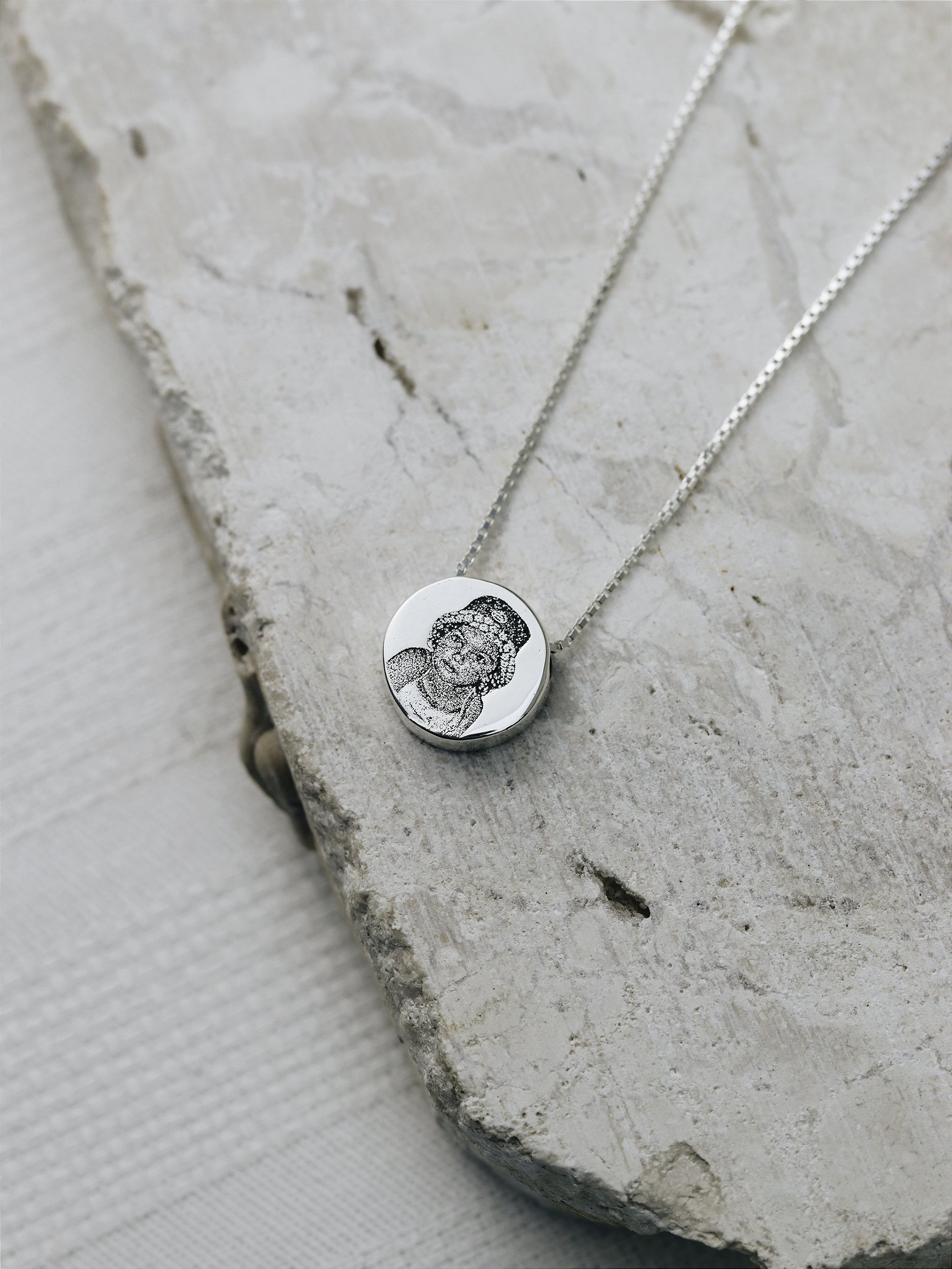Delicado e cheio de significado, o Colar Fotogravação Pequeno é perfeito para carregar lembranças discretas e elegantes. Disponível no formato redondo (13mm) ou quadrado com canto arredondado (12x9mm), ambos com 3,5mm de espessura. Pode ser personalizado com foto e, no verso, conter uma escrita ou até outra imagem. Nossa tecnologia de fotogravação realista preserva os detalhes para sempre, sem risco de desgaste.