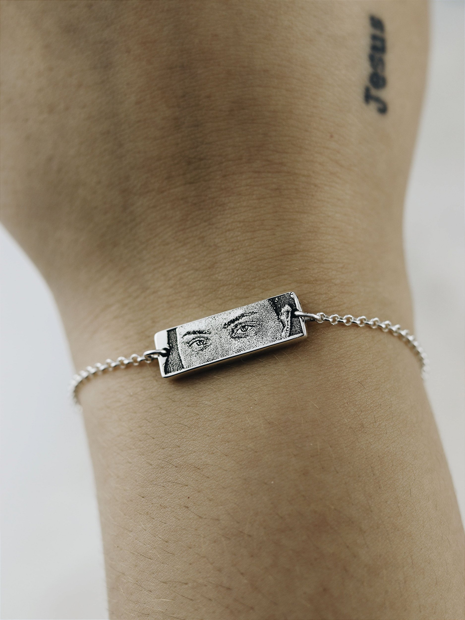 O pingente — disponível em formato redondo (14mm) ou retangular (24,5 x 8mm) — possui 2,5mm de espessura, tornando a peça robusta, resistente e muito mais durável do que modelos finos. Na frente, recebe fotogravação realista, que preserva todos os detalhes da imagem sem desgaste com o tempo. No verso, é possível adicionar uma escrita especial ou até uma segunda imagem, tornando cada joia única.